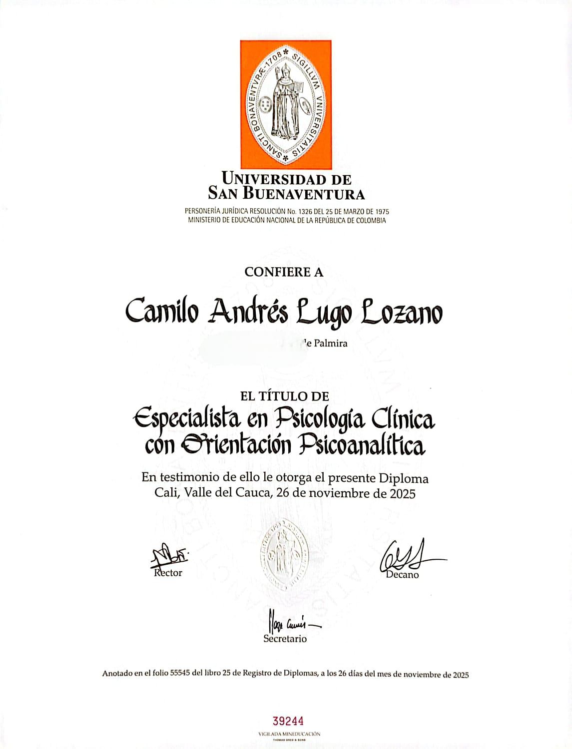 Soy Camilo Lugo, psicólogo clínico de orientación psicoanalítica. Acompaño a personas que atraviesan momentos de dolor, confusión o crisis personal, ayudándolas a encontrar un espacio donde puedan detenerse, escucharse y darle sentido a lo que viven.